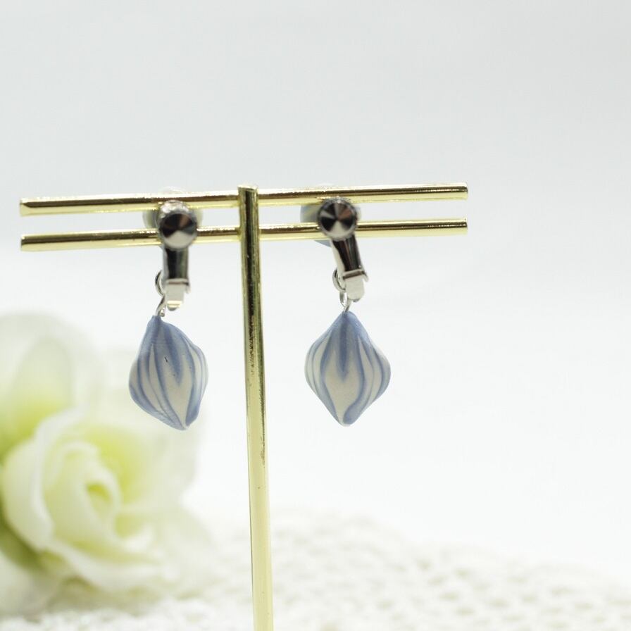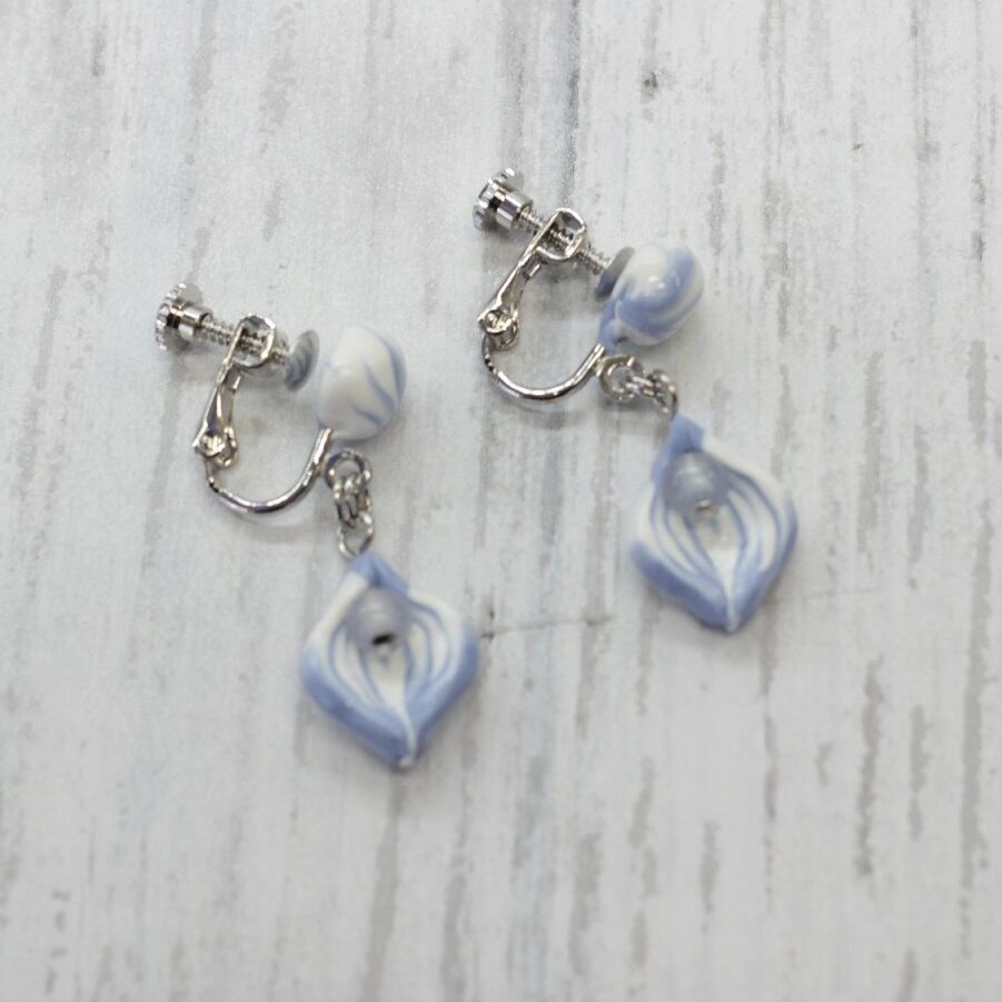 アメリカ製樹脂粘土で作ったイヤリングです。クレイを混色して作ったサックスカラーとホワイトで作った花びら模様のクレイを使いました。